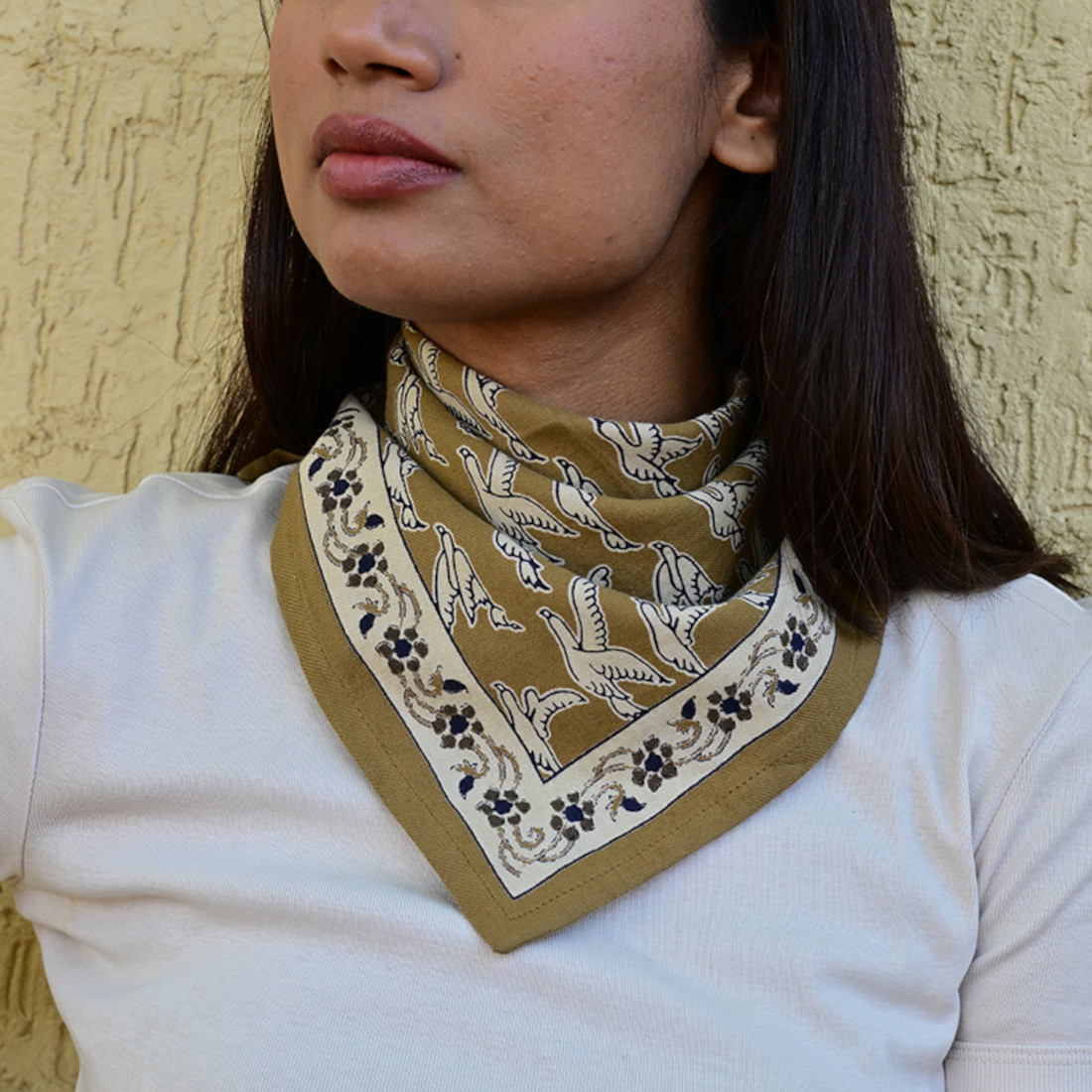 Donnez du caractère à votre allure avec le petit foulard Mercure Bistre (couleur brun-olive profond et chaud) de Byzantine. Ce carré généreux de 50x50 cm est fabriqué en 100% twill de coton indien, un tissu résistant et d'une grande douceur. Sa particularité ? Une impression artisanale réalisée selon la technique du blockprint : les motifs d'oiseaux sont appliqués à la main avec des tampons en bois et des encres d’origine végétale. Léger et facile à porter, ce petit foulard se noue de mille façons pour sublimer vos tenues quotidiennes. Une pièce unique qui mise sur les matières naturelles pour donner une touche preppy-chic à votre tenue.