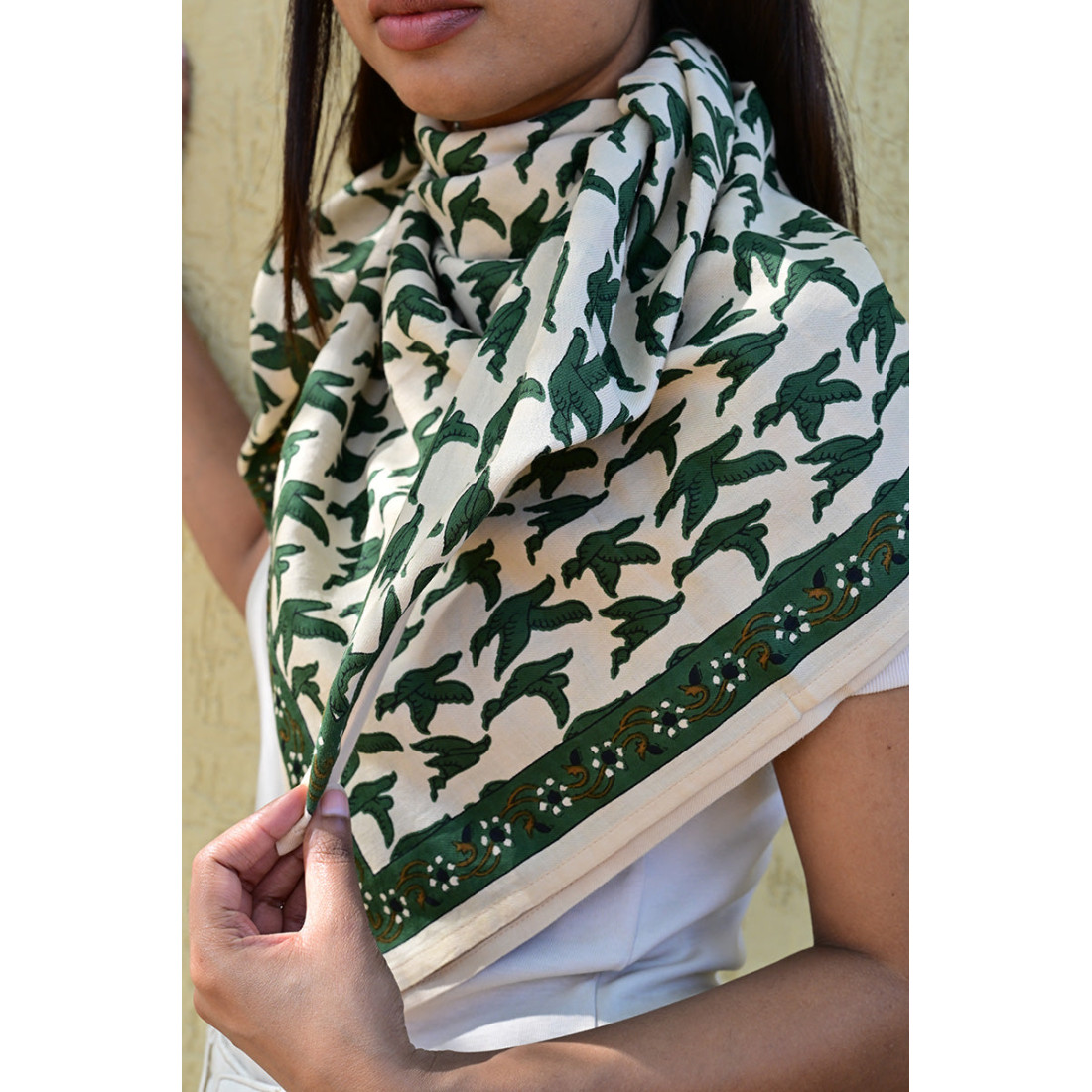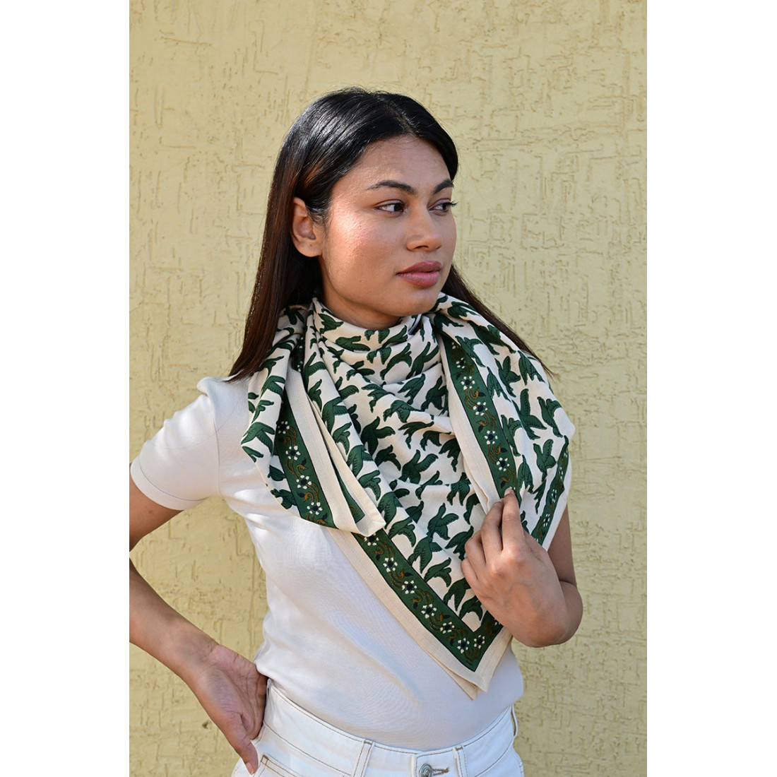 Donnez du caractère à votre allure avec le grand foulard Mercure Forêt de Byzantine. Ce carré généreux de 100x100 cm est fabriqué en 100% twill de coton indien, un tissu résistant et d'une grande douceur. Sa particularité ? Une impression artisanale réalisée selon la technique du blockprint : les motifs d'oiseaux vert foncé sont appliqués à la main avec des tampons en bois et des encres d’origine végétale. Léger et facile à porter, ce grand foulard se noue de mille façons pour sublimer vos tenues quotidiennes. Une pièce unique qui mise sur les matières naturelles pour donner une touche preppy-chic à votre tenue.