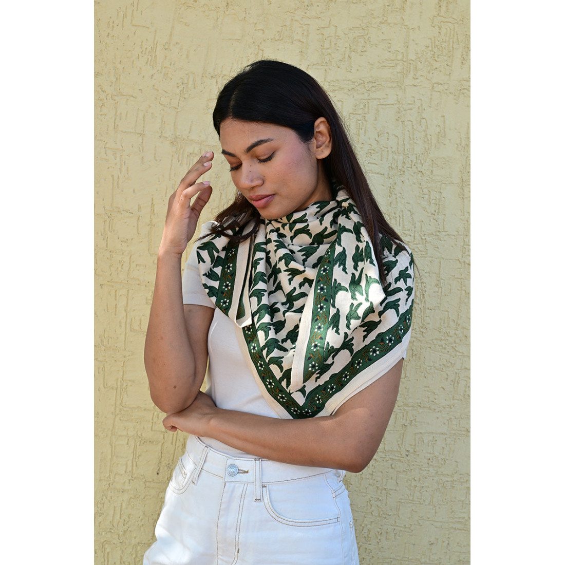 Grand foulard 100x100 cm Mercure Forêt motifs oiseaux verts.