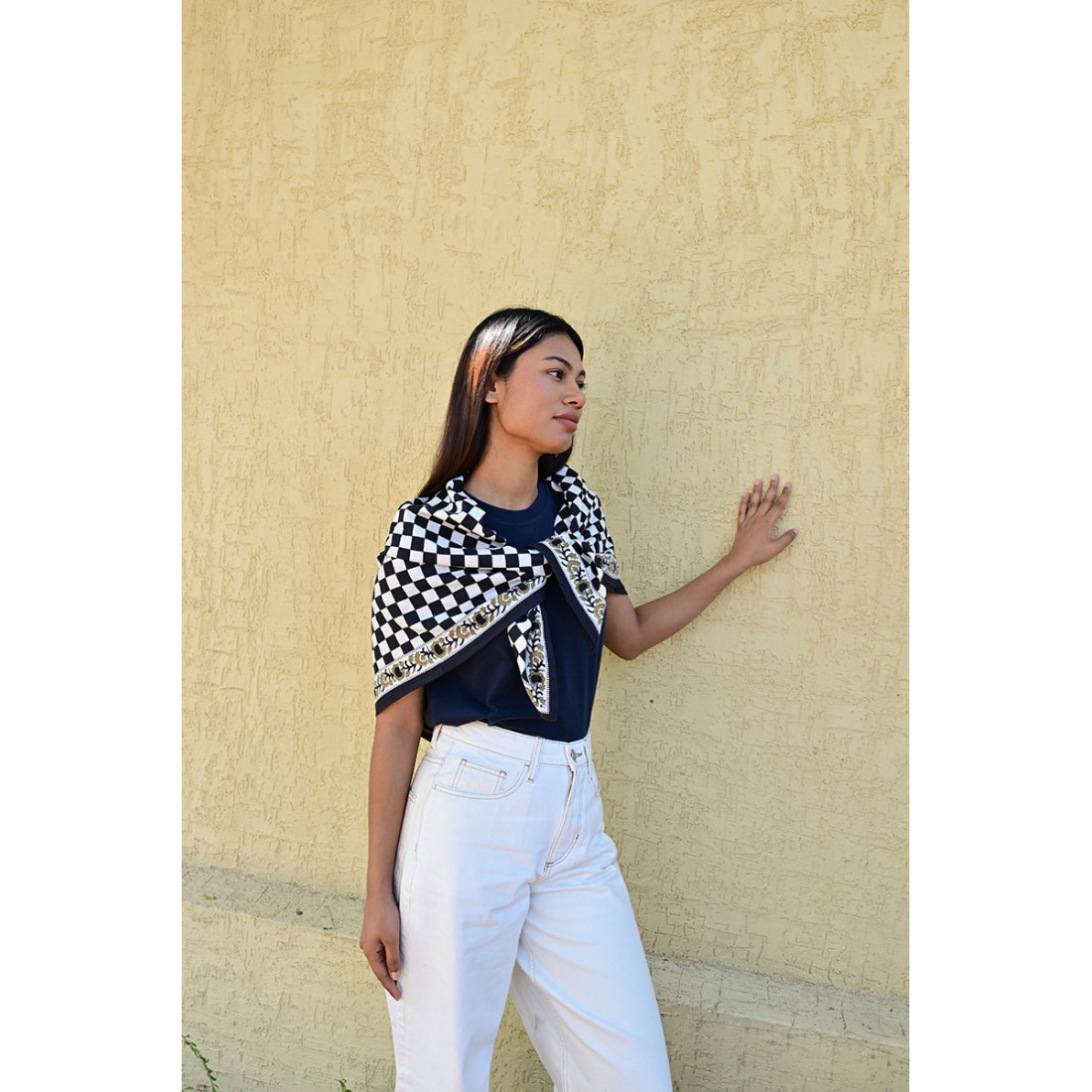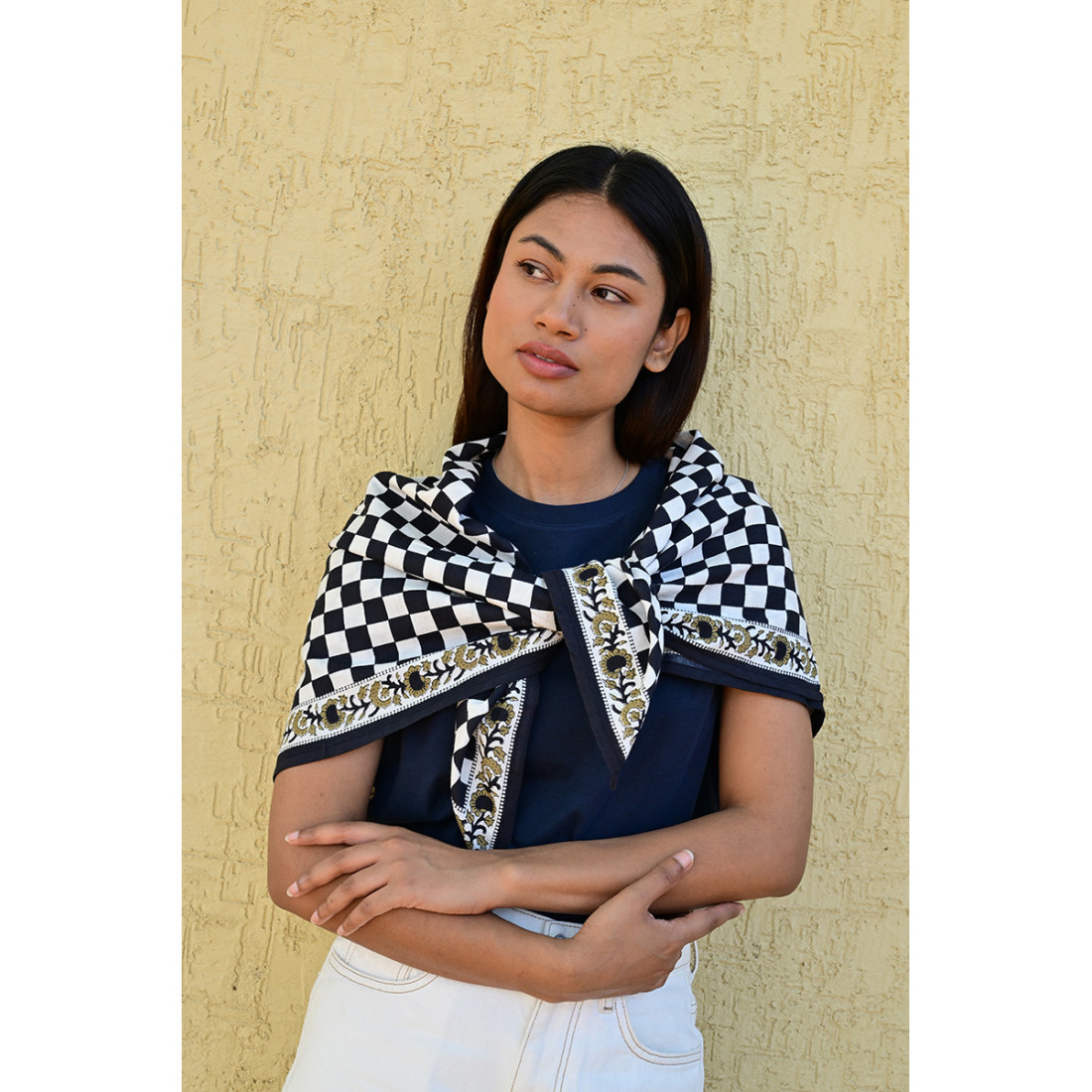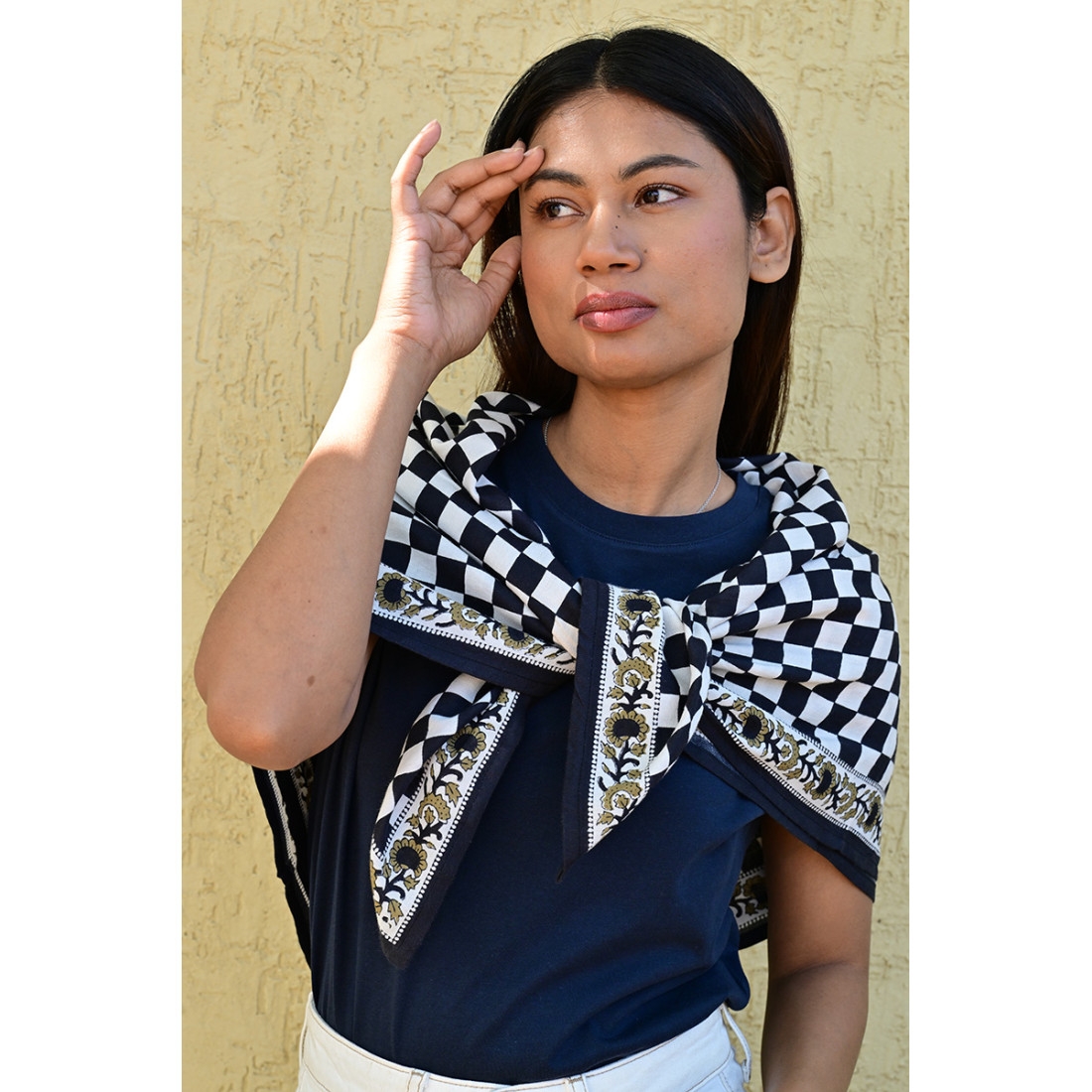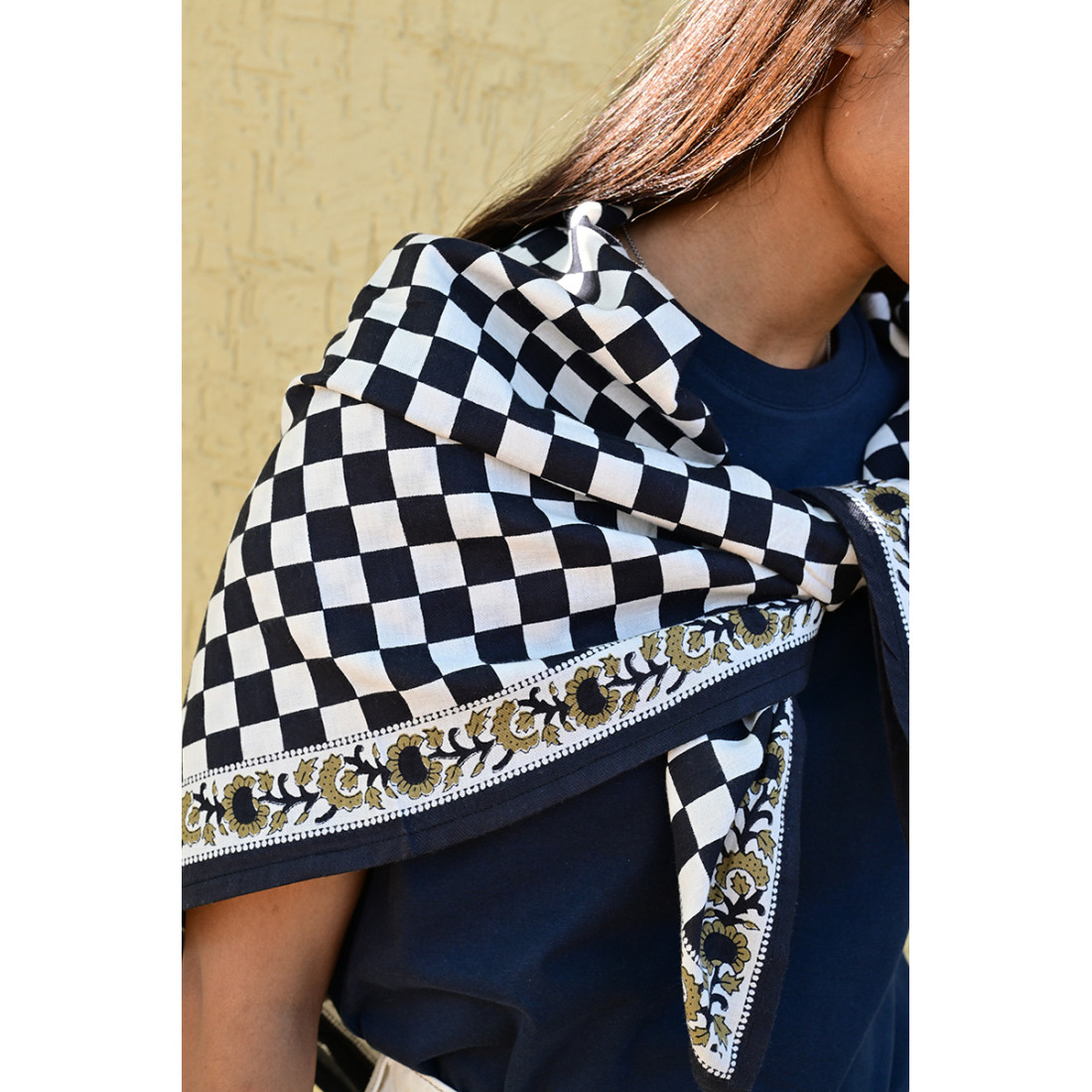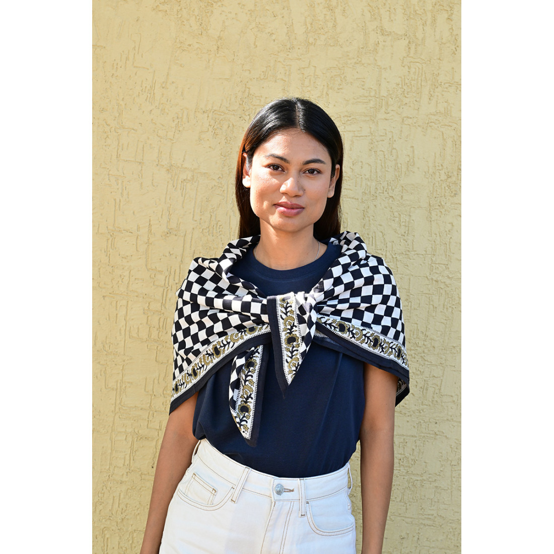 Donnez du caractère à votre allure avec le grand foulard Checks Nuit de Byzantine. Le motif damier classique est ici revisité avec une bordure florale finement travaillée. Ce carré généreux de 100x100 cm est fabriqué en 100% twill de coton indien, un tissu résistant et d'une grande douceur. Sa particularité ? Une impression artisanale réalisée selon la technique du blockprint : le motif damier et sa bordure florale sont appliqués à la main avec des tampons en bois et des encres d’origine végétale. Léger et facile à porter, ce grand foulard se noue de mille façons pour sublimer vos tenues quotidiennes. Une pièce unique qui mise sur les matières naturelles et un design graphique pour un look à la fois décontracté et soigné.