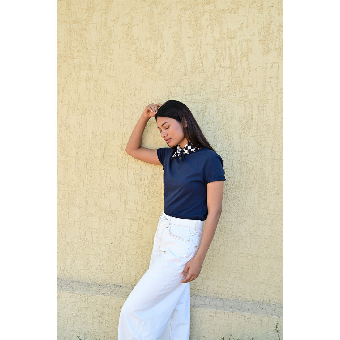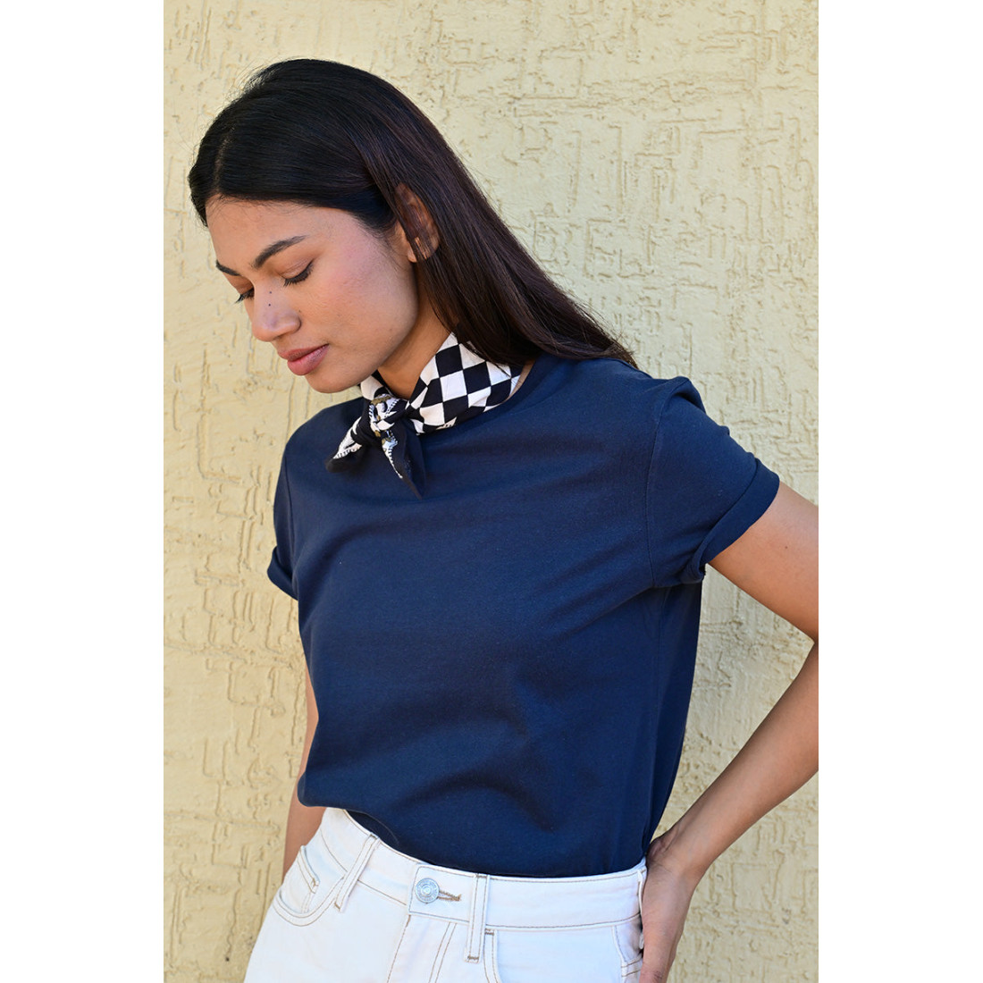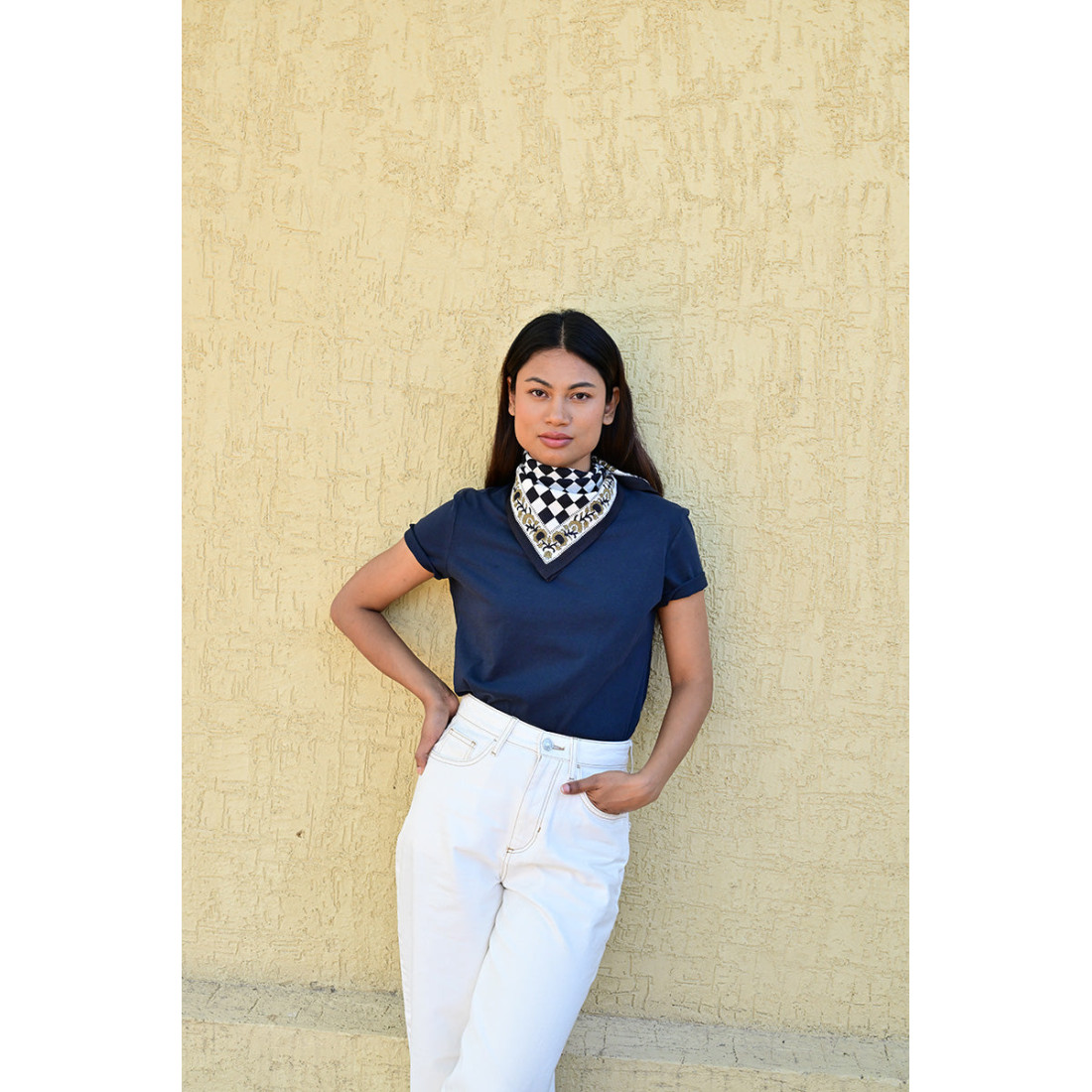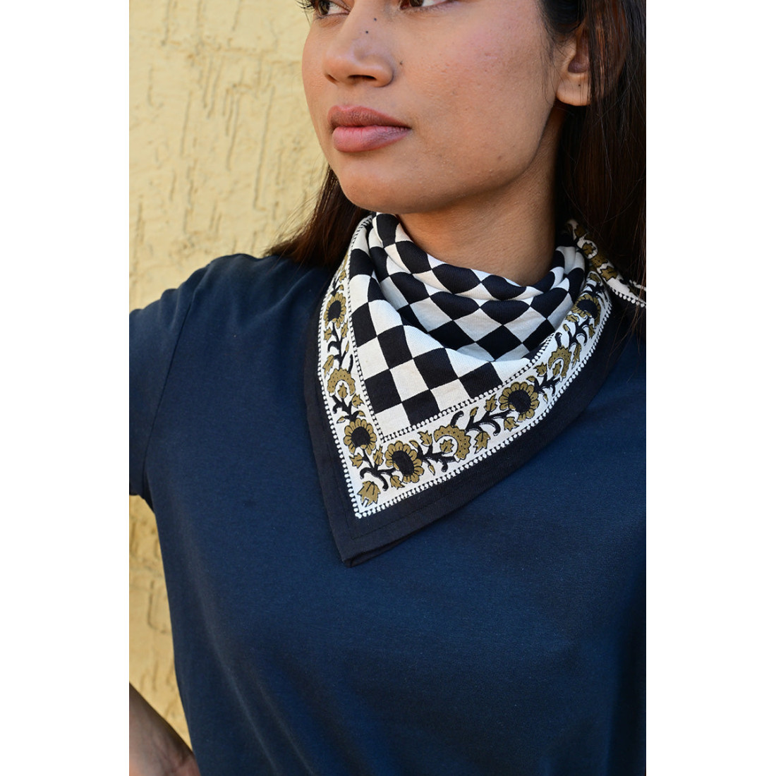 Femme portant le petit foulard Checks Nuit 50x50 cm noué autour du cou.