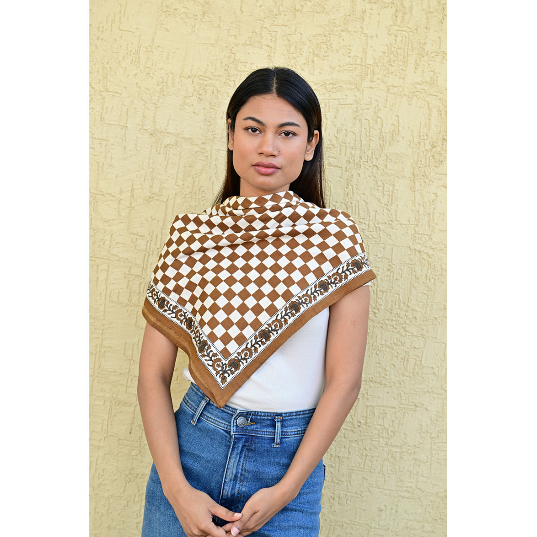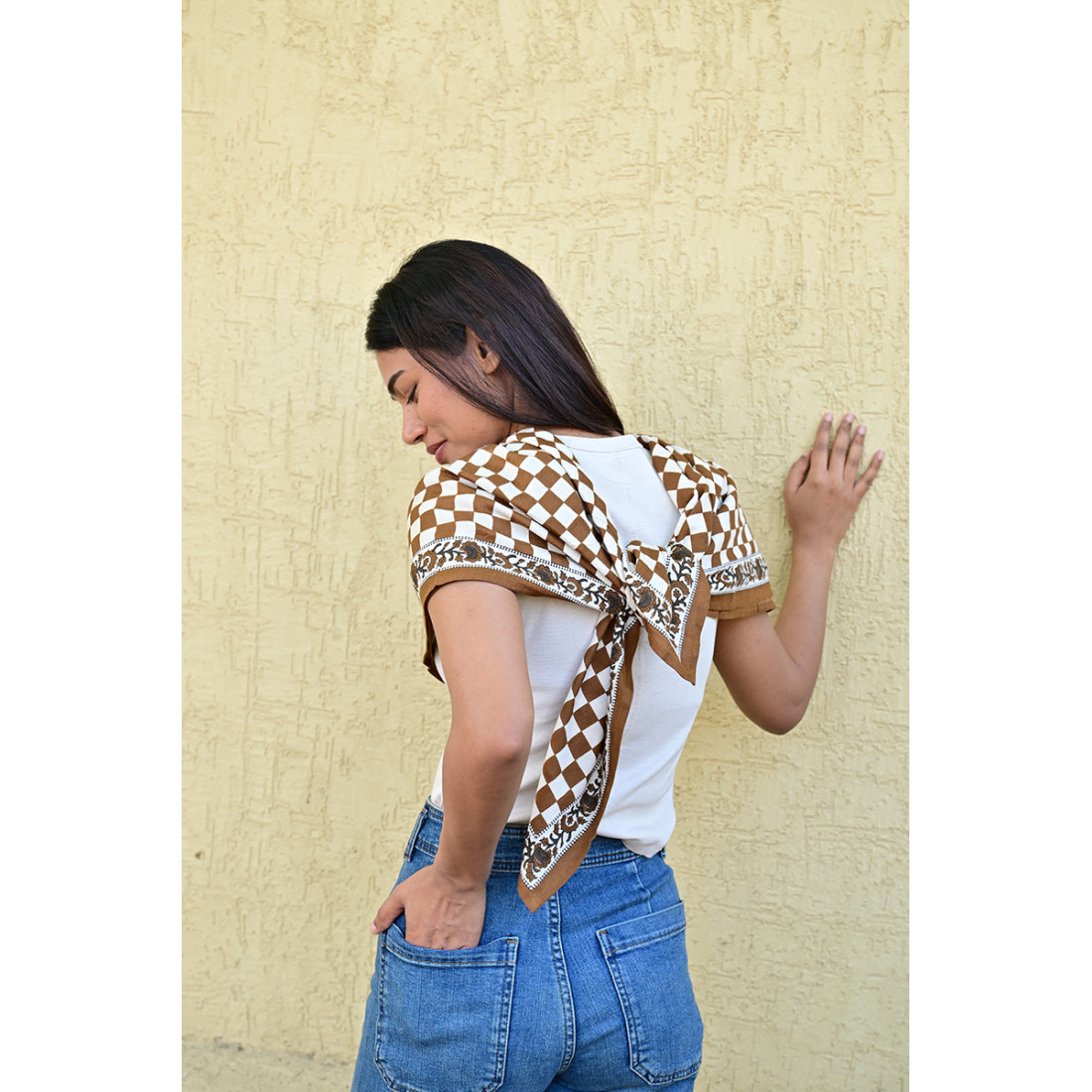 Grand foulard 100x100 cm Checks Bistre motif damier en coton.