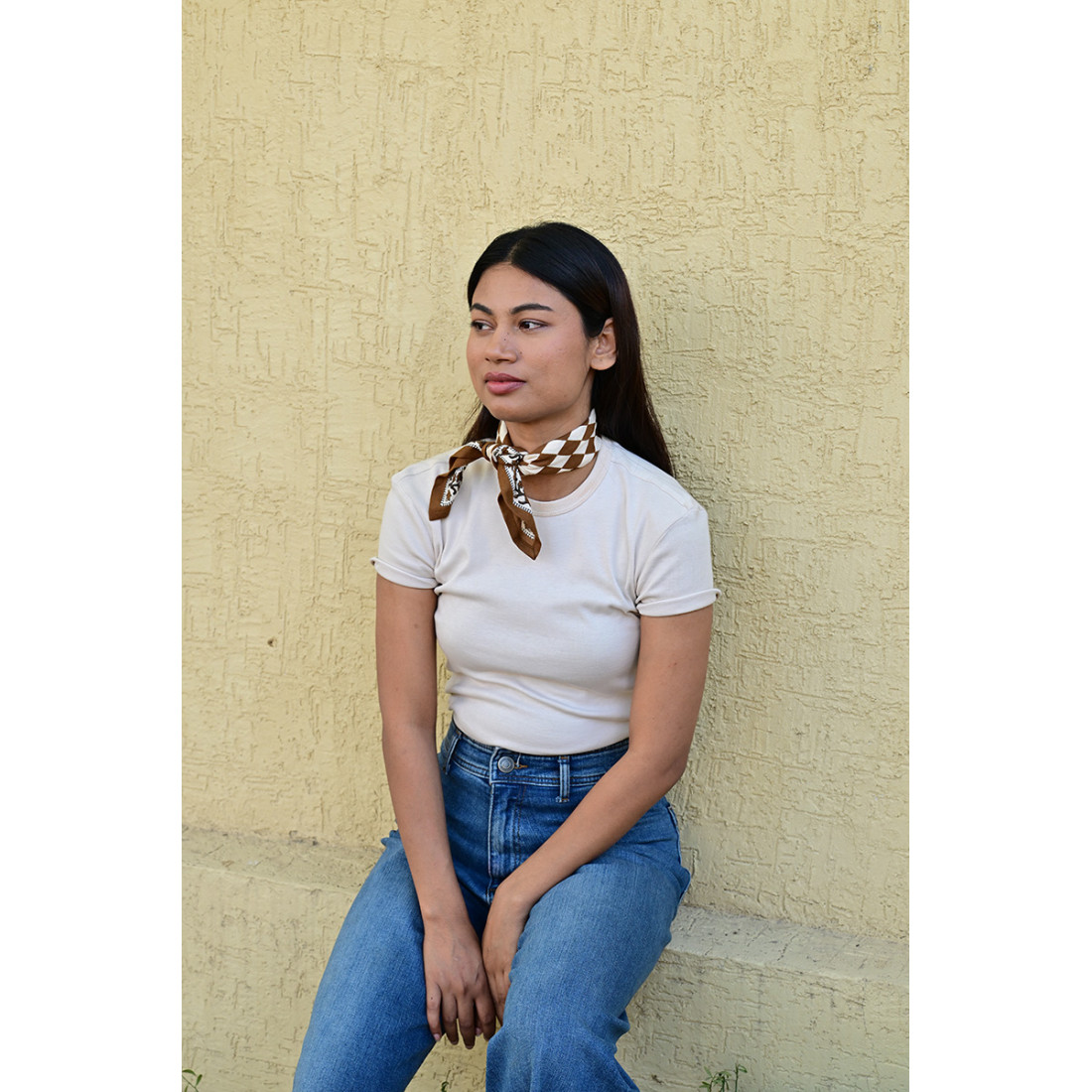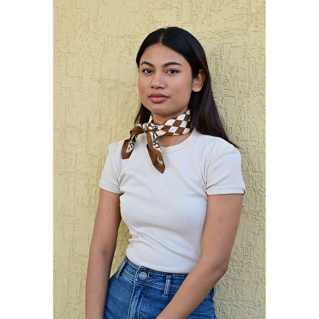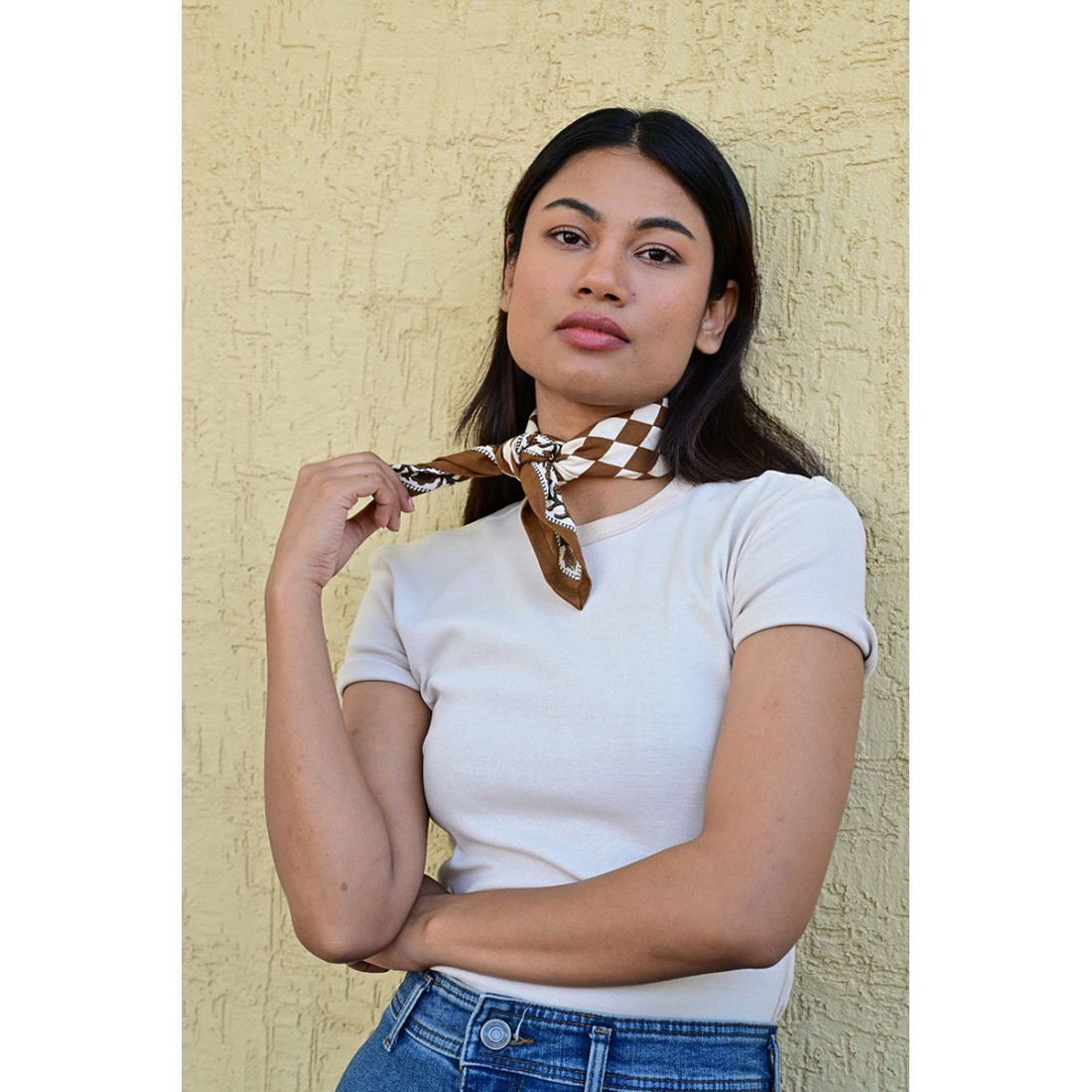 Femme portant le petit foulard Checks Bistre 50x50 cm noué autour du cou.