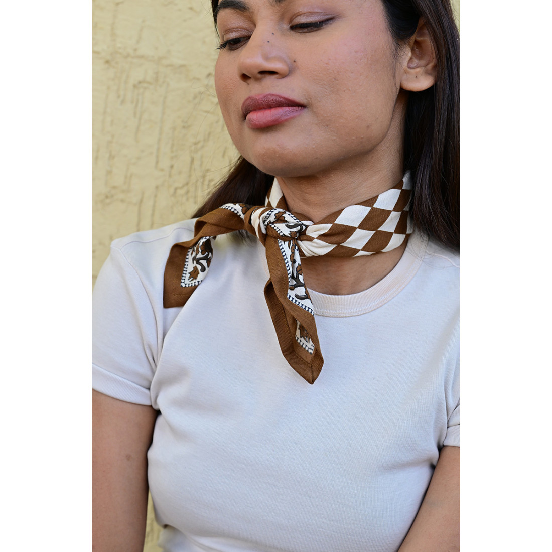 Donnez du caractère à votre allure avec le petit foulard Checks Bistre (couleur brun-olive profond et chaud) de Byzantine. Le motif damier classique est ici revisité avec une bordure florale finement travaillée. Ce carré généreux de 50x50 cm est fabriqué en 100% twill de coton indien, un tissu résistant et d'une grande douceur. Sa particularité ? Une impression artisanale réalisée selon la technique du blockprint : le motif damier et sa bordure florale sont appliqués à la main avec des tampons en bois et des encres d’origine végétale. Léger et facile à porter, ce petit foulard se noue de mille façons pour sublimer vos tenues quotidiennes. Une pièce unique qui mise sur les matières naturelles pour donner une touche preppy-chic à votre tenue.