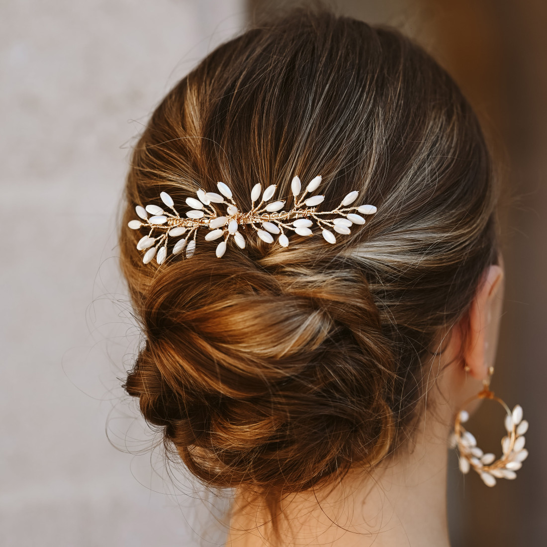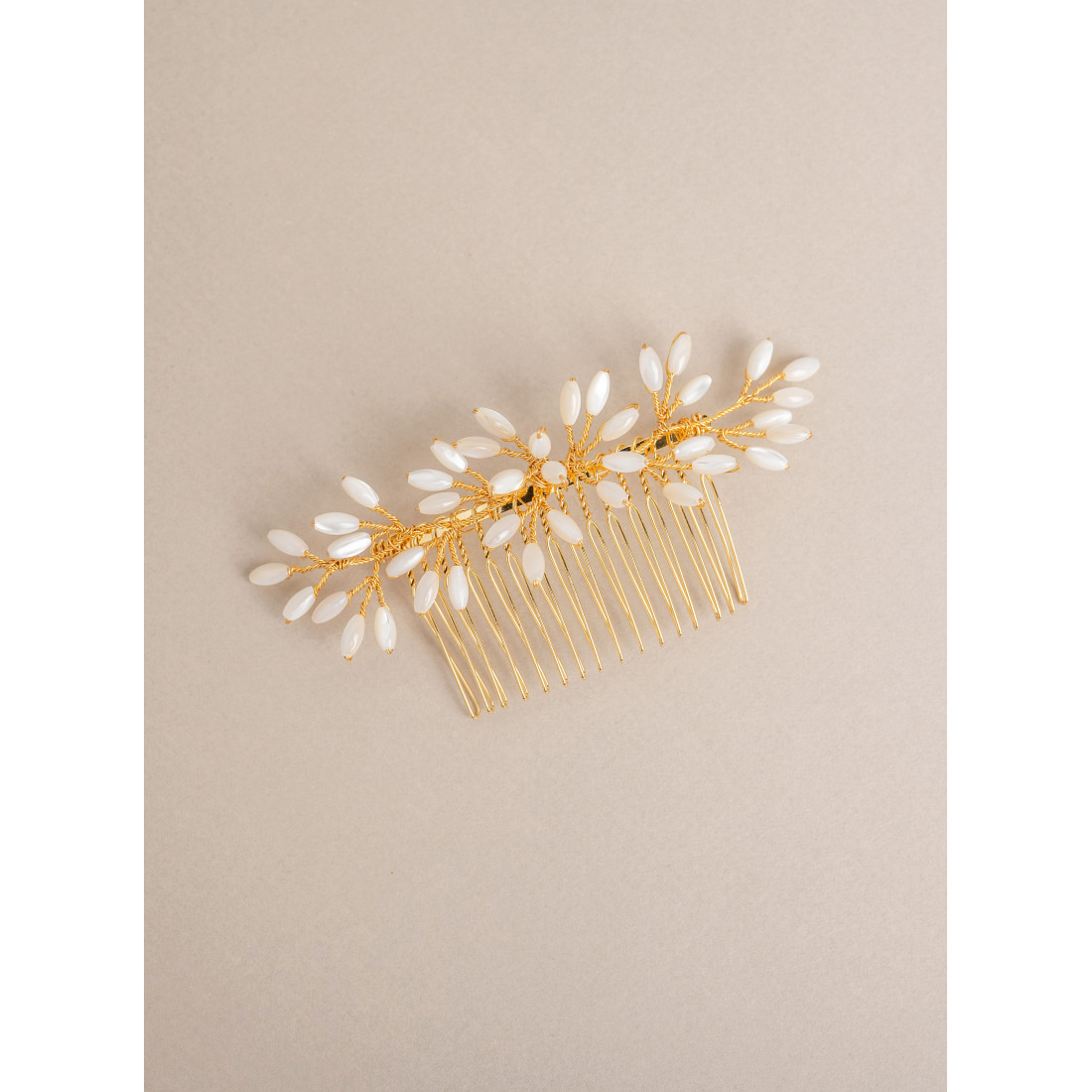 Sublimez votre coiffure avec le peigne de mariage Capucine. Orné de perles en nacre naturelle, ce peigne se glisse dans un chignon ou une attache floue. Une création Les Perles de la Bastide alliant maintien parfait et élégance végétale.